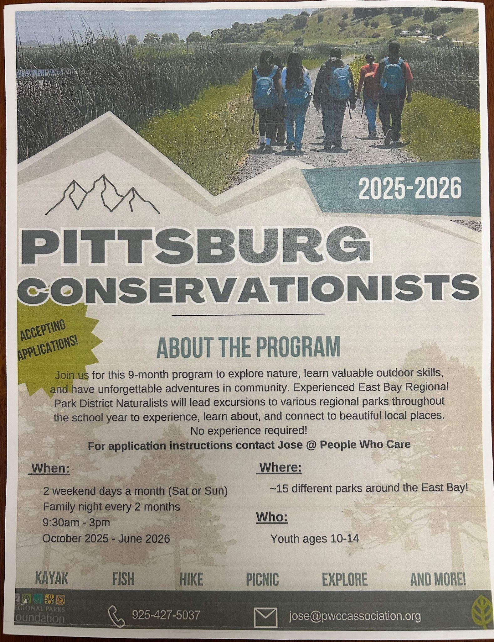 Join us for this free outdoor program that specializes in kayaking, fishing, hiking, exploring, camping, and picnicking around 15 different parks around the East Bay! If you are interested, please contact our Community School Coordinator, Mr. Rodriguez via email at: jricardorodriguez@pittsburgusd.net